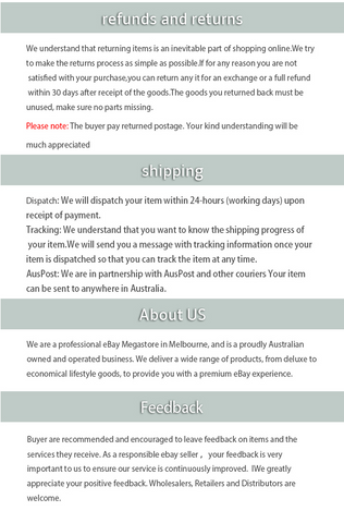 Buyer are recommended and encouraged to leave feedback on items and the services they receive. As a responsible bebay seller, your feedback is very important to us to ensure our service is continuously improved. We greatly appreciate your positive feedback, Wholesalers, Retailers and Distributors are welcome.